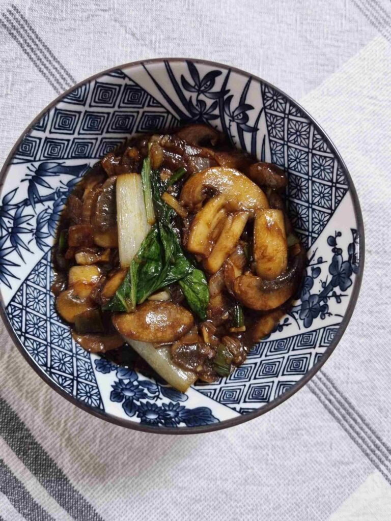 The Bok Choy & Mushroom Stir-fry is ready to eat. This dish is a simple recipe that can serve as both a side-dish to a main-meal or as a main meal itself. The flavours are bold and savoury.
