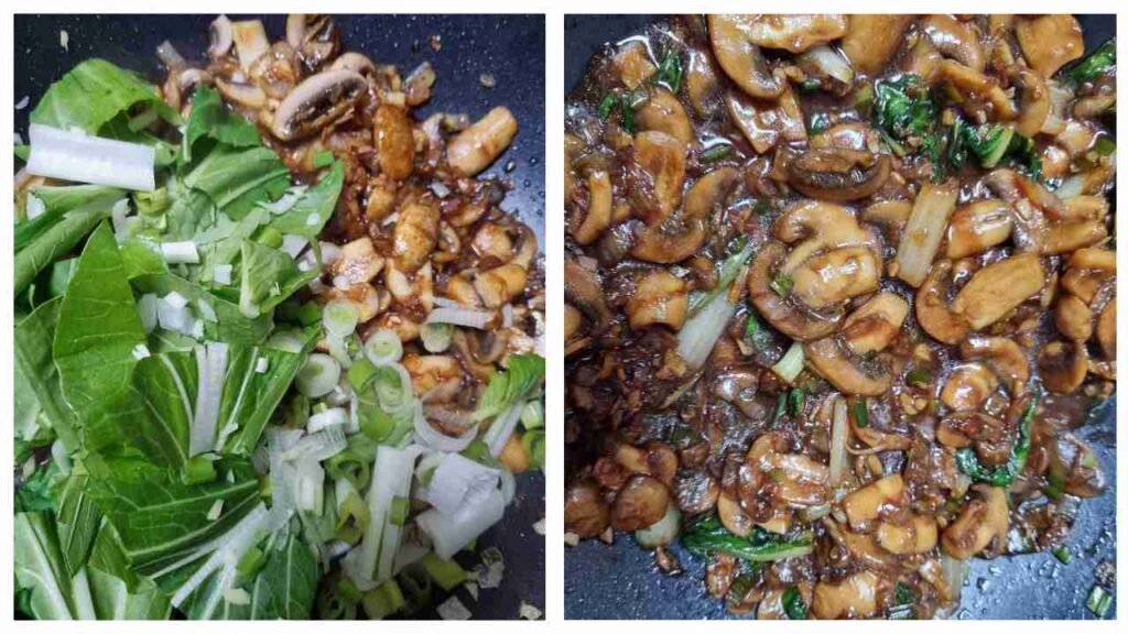 Mushrooms take about ten minutes to release all of the liquid. This will also vary depending on the type of mushroom used. Stir the mixture occasionally. During that time, wash the Bok Choy and chop into smaller pieces. Add in the Bok Choy to the wok. Sauté until the liquid has reduced into a sauce.