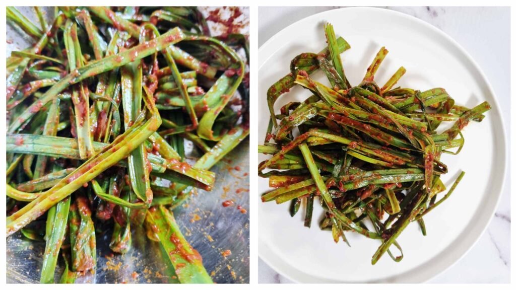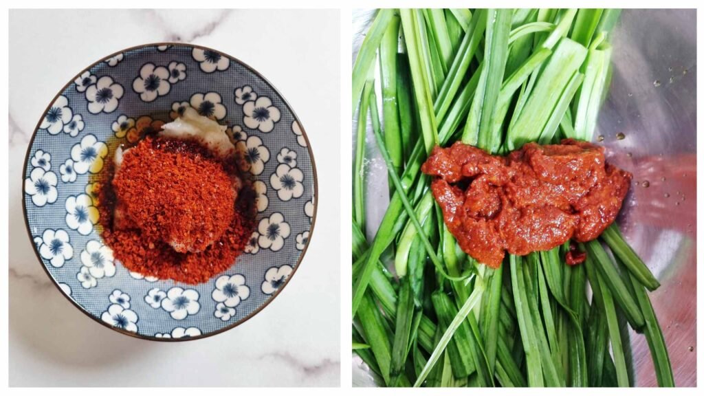 Combine the garlic chives with the red pepper paste, ensuring all the chives are fully covered. You can leave the Buchu Kimchi in the fridge for a few minutes or eat it right away.