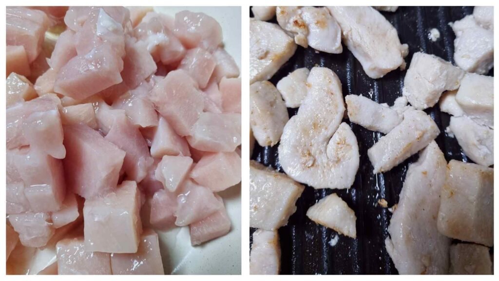 How to cook your chicken? There are two ways to cook moist and tender chicken breast. The first method is to shallow-poach the chicken. Start by defrosting the chicken breast and slicing the chicken into cubes and slices. Add a little bit of water to a pan along with butter.