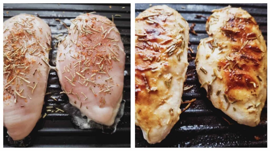 If you are short on time and want to grill the chicken as fast as possible. Add butter to a grill pan. Add the defrosted chicken breast with rosemary and cook for approximately six minutes on each side, using a grill pan lid or a piece of foil.