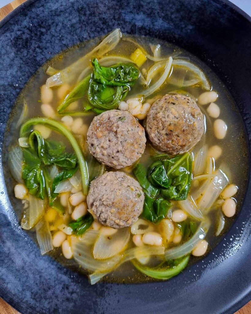 Cannellini beans, Beef meatballs, Onion, Celery, Garlic, Chicken Stock cube, Bay leaf, Thyme, Paprika powder, White Pepper, Spinach and Water.