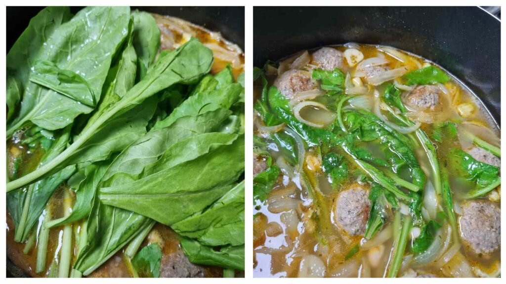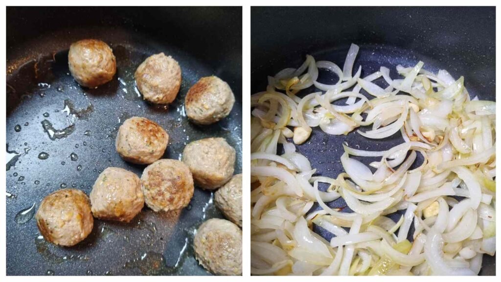 Chop the garlic cloves, slice the onions. Drain the cannellini beans and rinse them in running water. Rinse the spinach and set it aside. Prepare a pot and add cooking oil. Add the meatballs and sauté until they are golden brown on all sides. Thereafter, remove the meatballs from the pot and set them aside.