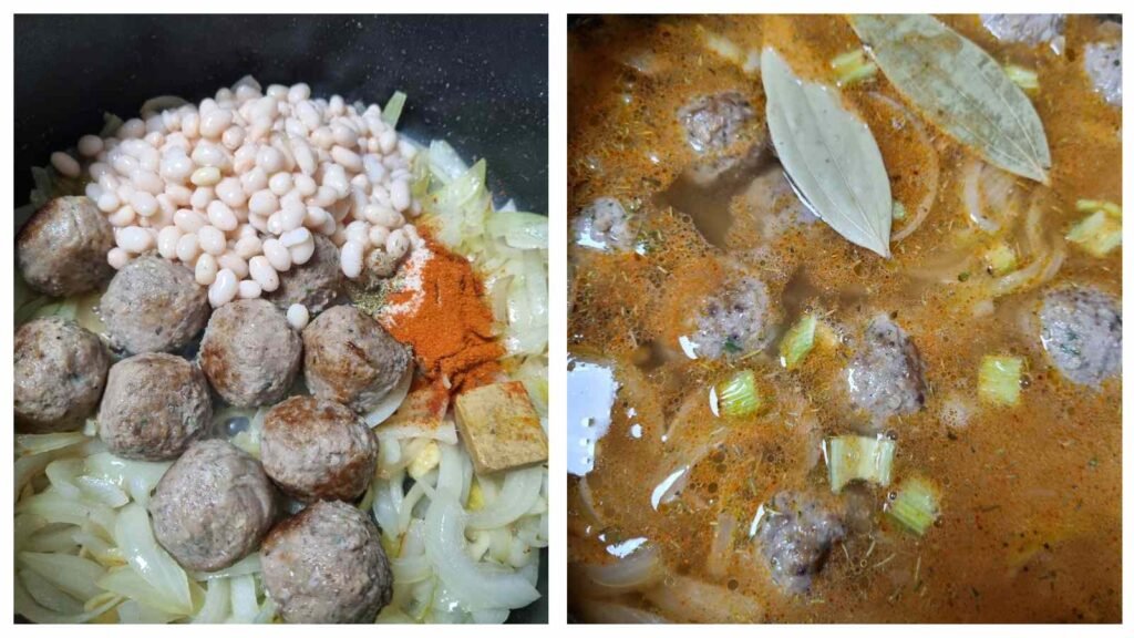 Add the onion and garlic. Cook the aromatics for 8 minutes on medium-low heat, stirring occasionally. Add the meatballs back into the pot, and drain the liquid from the can of cannellini beans. Add the spices and beef stock cube to the pot. Add the water. Add the chopped celery and bay leaves. Simmer for twenty minutes.