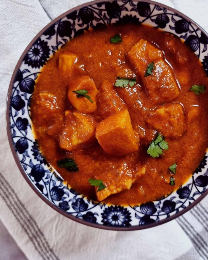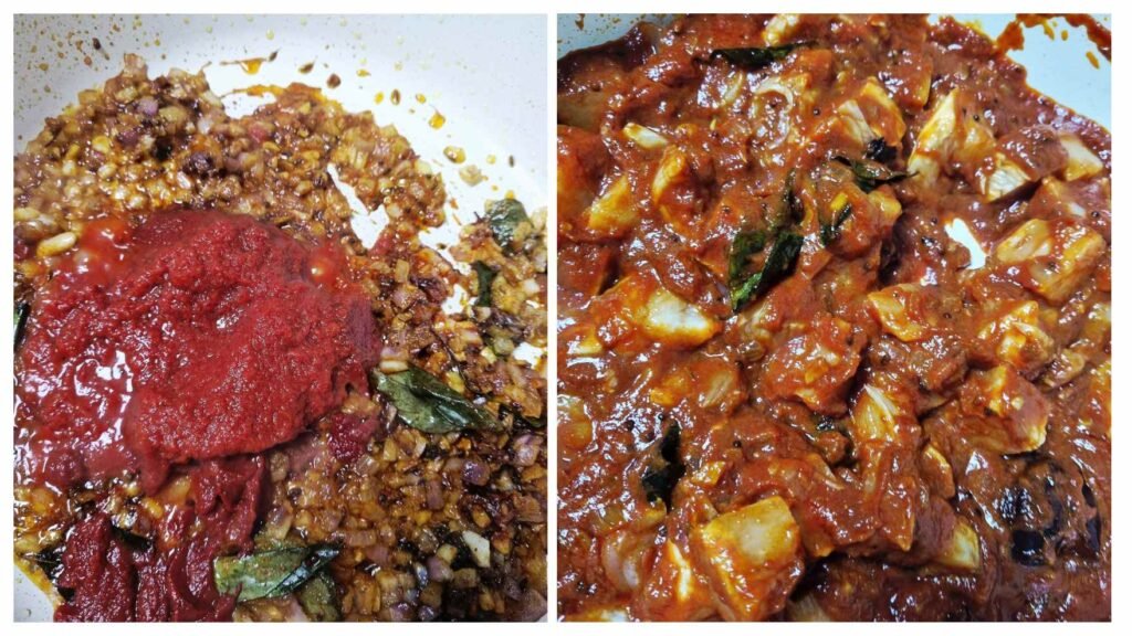 Tomato paste, along with tomato passata, creates a tomato-based gravy balanced with brown sugar and apple cider vinegar. Kokum is the wildcard in this recipe. Most South Indian curries use tamarind, which offers a tart flavour. Kokum is similar in nature. Coconut milk, along with kokum, adds a tangy taste to the chicken curry.