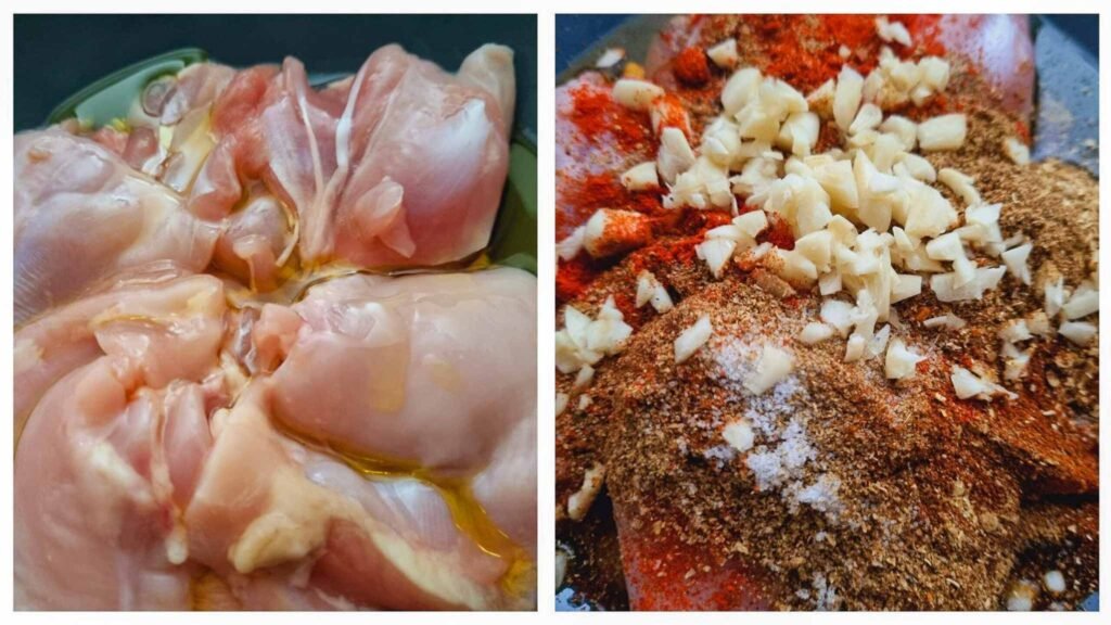 Start by placing the washed chicken in a bowl, ensuring to pat it dry. Add olive oil, followed by your choice of spices and minced garlic. The chicken will develop a vibrant red and brown color.