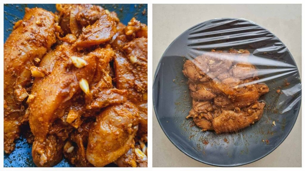 Cover the bowl with cling wrap and let the chicken marinate in the spices. This step is crucial, as it significantly enhances the flavor of your Chicken Shawarma.