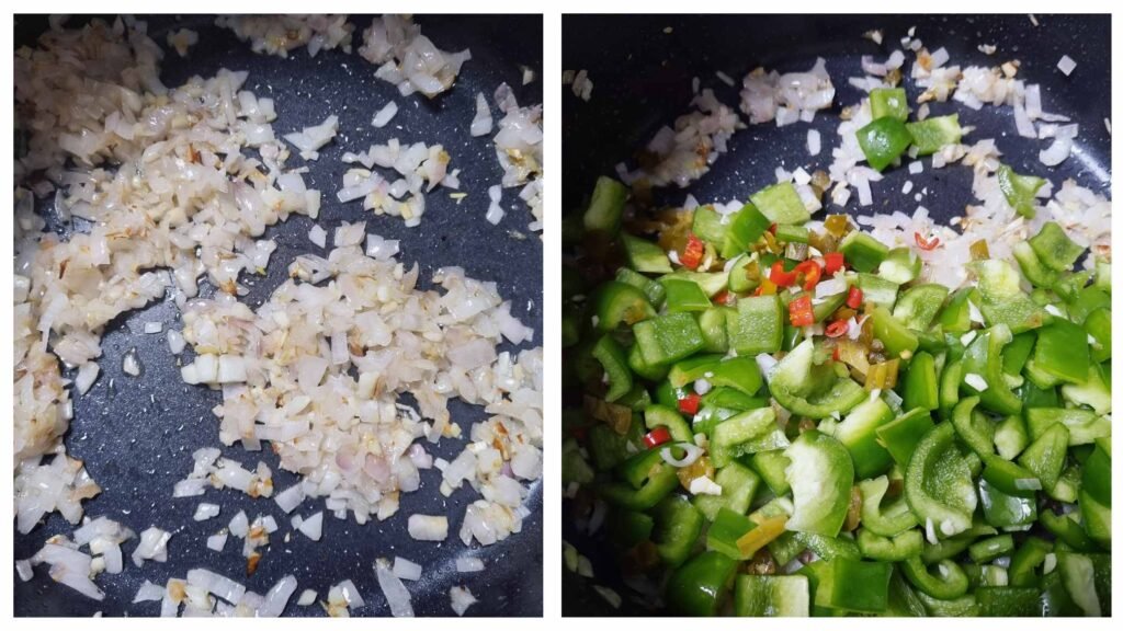 Finely chop the onion and garlic. Chop the bell peppers into ⅔ inch cubes. Drain the brine from the canned beans and set them aside.