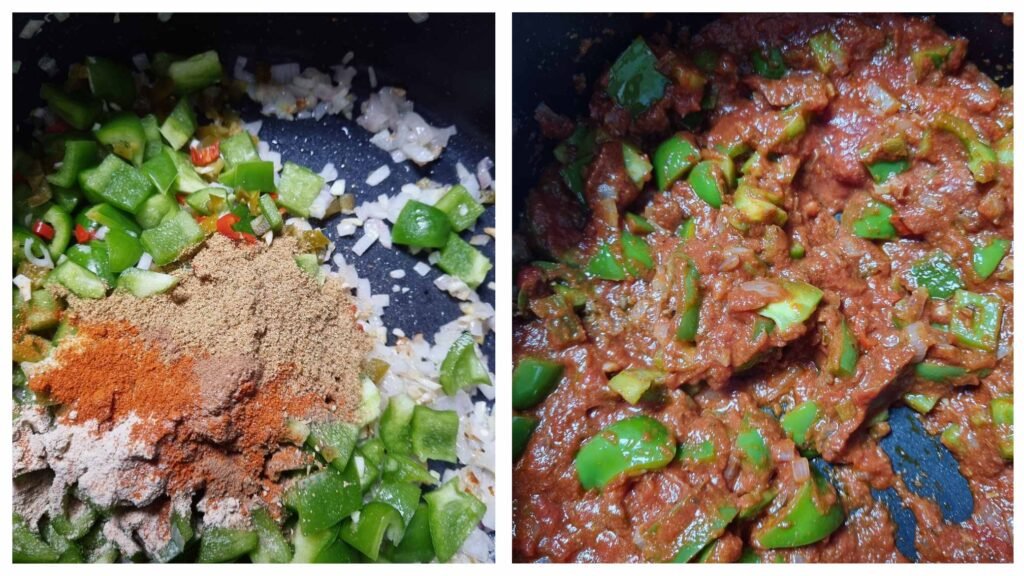 Preheat a pan to medium-low heat, drizzle the olive oil, and add the chopped onions and garlic to the pot. Sauté the onions and garlic for five to six minutes, then add the chopped bell peppers. Add the cumin powder, paprika powder, cinnamon powder, ginger powder and the garlic powder.