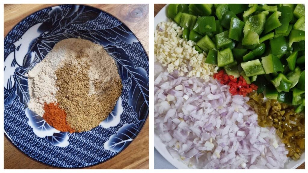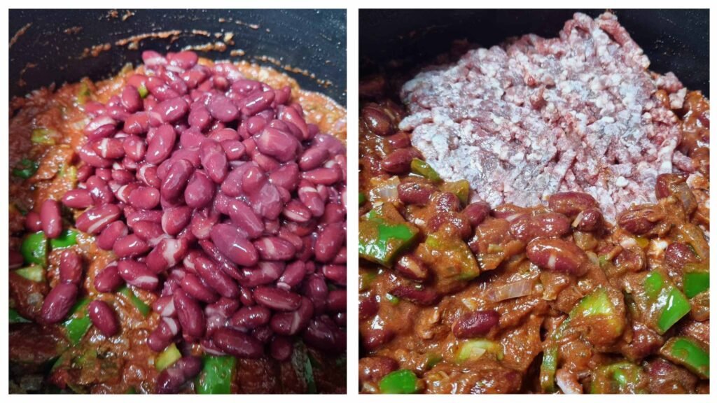 Beef Mince, Beef Bouillon cube, Apple Cider Vinegar, Water, Tomato paste, Worcestershire sauce, Olive oil, Kidney Beans, Bell peppers, Large Onion, Garlic cloves, Jalapeno, Red Chilies, Tomato Passata, Cumin powder, Paprika powder, Ginger powder, Salt, Cinnamon powder, Dried Oregano, Garlic powder.