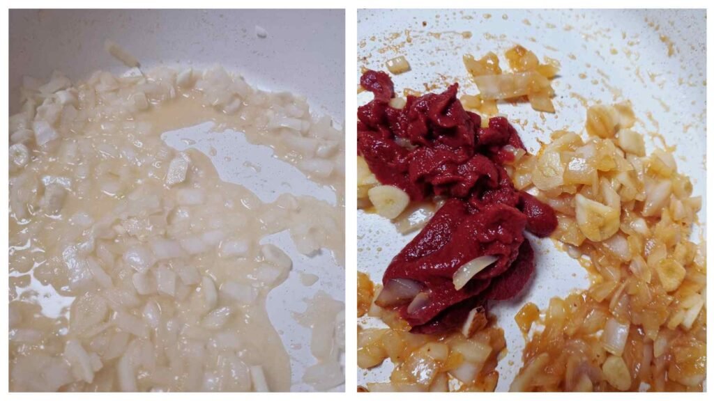 Clean the garlic cloves, then slice and cube the onions. Add the aromatics to the pot that has the reserved chicken liquid, which will still have a bit of butter in it. Sauté the onion and garlic until they are golden brown. Add the tomato paste. (Start cooking the pasta at this point; it should take 8 minutes for the pasta to be al dente. Reserve pasta water for the final step.)