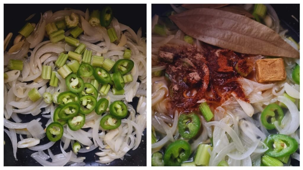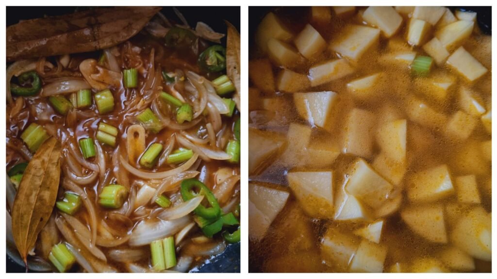 Add the spices: Add the nutmeg, paprika powder, black pepper, and salt. Add the bay leaves and chicken stock cube. Add 1/2 cup of water. Mix the ingredients. Let it simmer for a few minutes. Thereafter, add the balance of the water and potatoes. Cook for 15 minutes on medium-high heat until the potatoes are soft and can be pierced with a fork.
