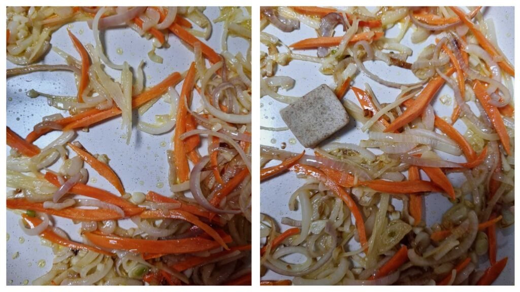 • Add julienned carrots and ginger; sauté for 3-4 minutes. Stir in a beef stock cube.