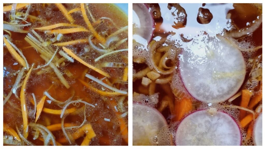 • Add water, soy sauce, oyster sauce, and apple cider vinegar. While simmering on medium-low heat, slice radishes into disks and add it to the soup.