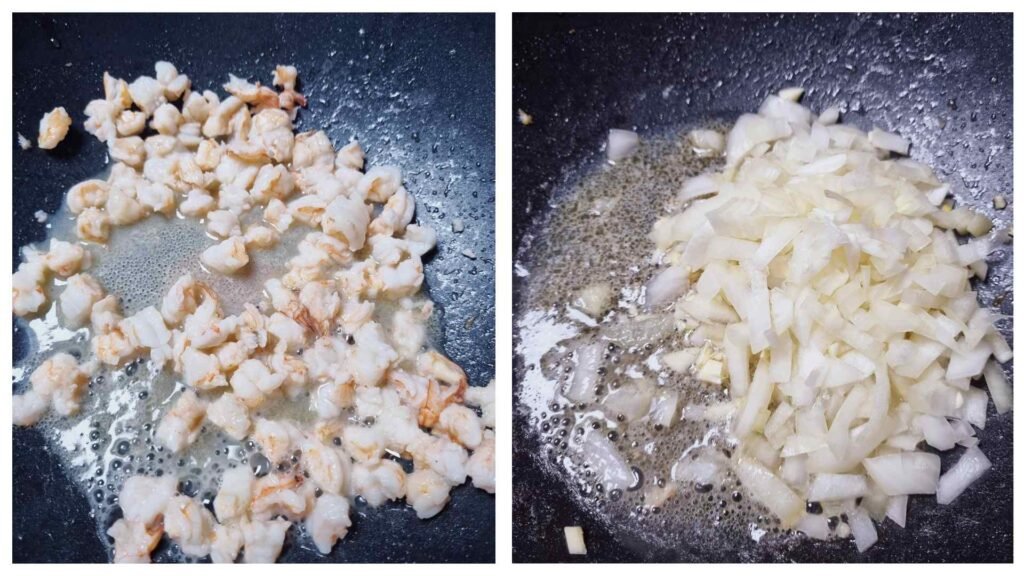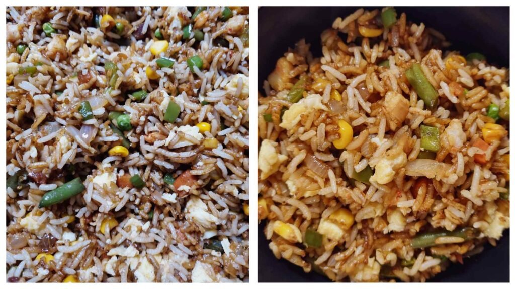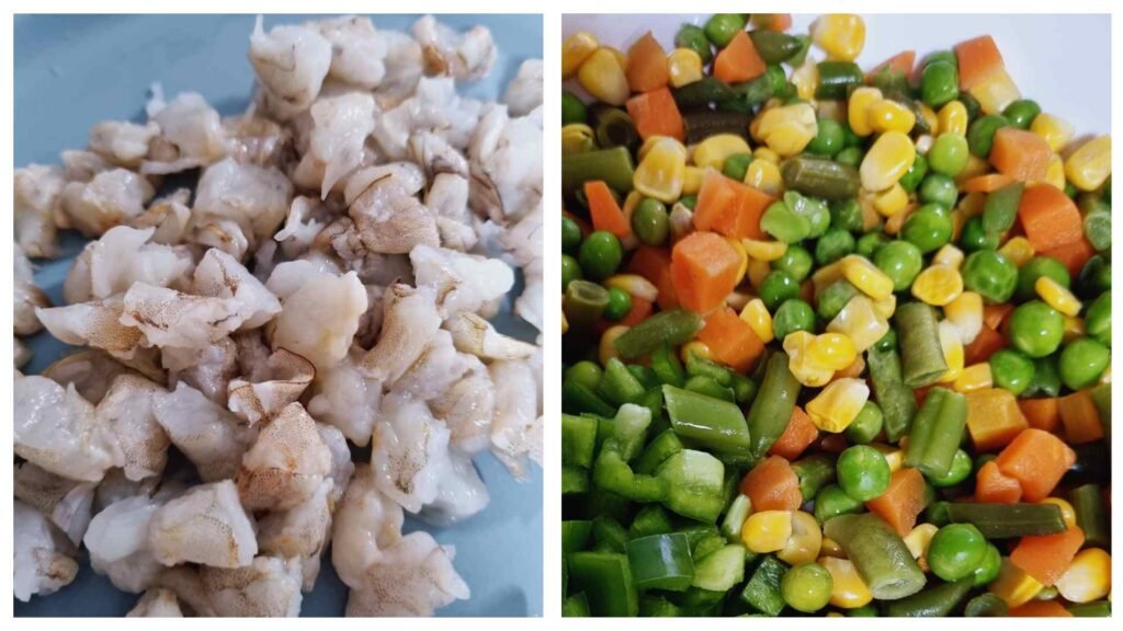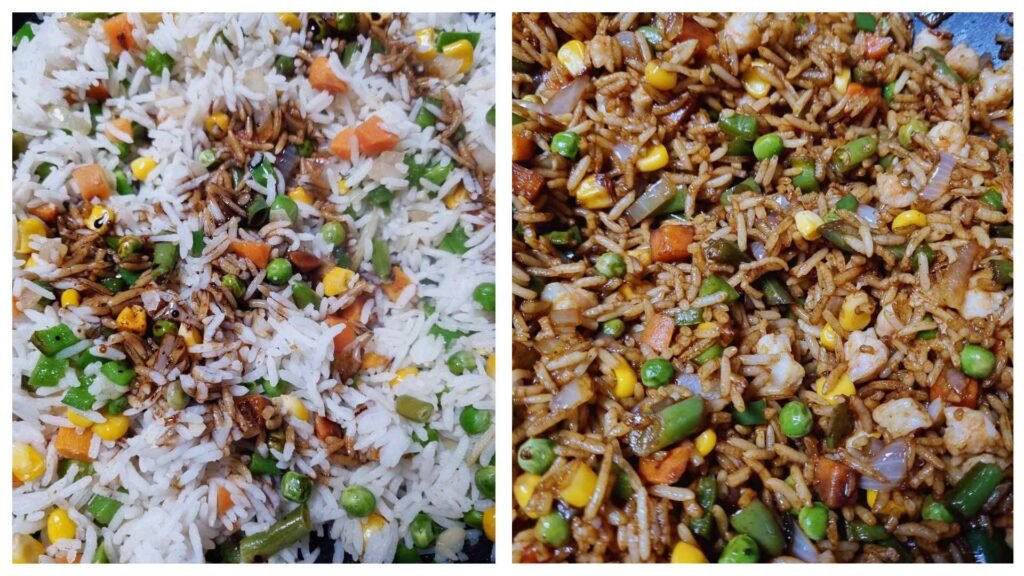 Fried rice does not usually contain root vegetables, which tend to soften. Viennas are optional and add a smoky layer to this dish. When cooked, onions and garlic cloves will caramelize, offering sweet and savoury notes. Soy sauce, Oyster sauce, and Sesame seed oil are crucial for the flavour of fried rice. Plant-based MSG is optional; you can also use regular MSG for that authentic fried rice flavour. Chinese chicken seasoning will enhance the dish’s flavour. You can use regular chicken seasoning if you have it. In place of shrimp, you can use thin strips of beef or thin slices of chicken breast.