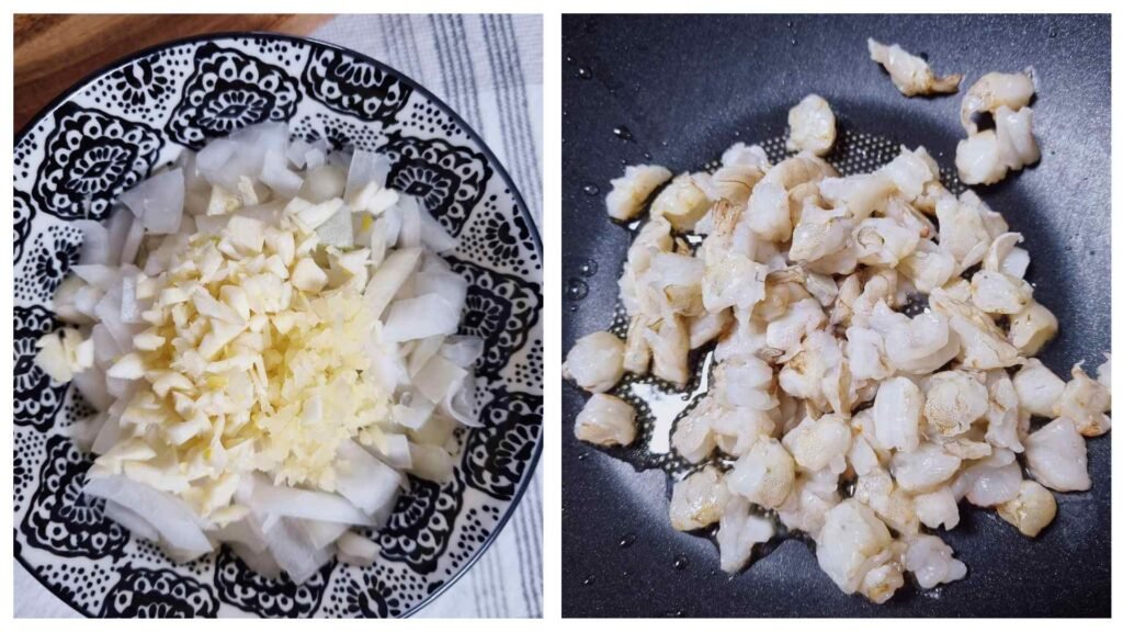 De-shell and devein the shrimp. The flesh should be chopped into half-inch pieces or even smaller if possible. If you are using pre-cleaned frozen shrimp, simply rinse them in water, then chop them into half-inch pieces.