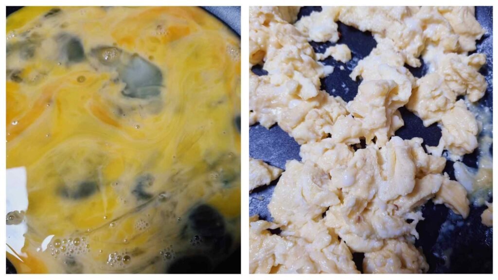 Adjust the temperature to medium-high heat and stir-fry the ingredients for five minutes, stirring every thirty seconds. You can cook the egg in a separate pan or in the same wok with the rice and vegetables. The egg will be added in the last minute, stir-fry the rice and all the ingredients until the egg is scrambled.