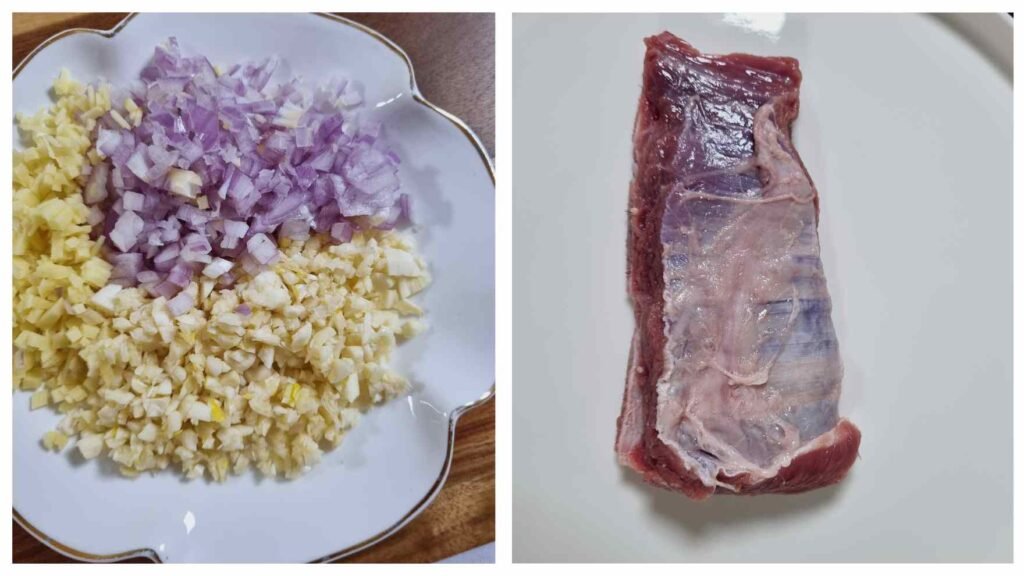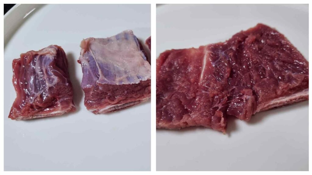 Short ribs are shorter, flatter, and fattier. Most of the meat is on one side of the bone, which is tough but flavourful. Short ribs are traditionally used in Galbi Jjim. When you purchase the ribs, choose the short ribs with thick meat, and ask the butcher to cut them into 1-inch lengths if they are not already cut.