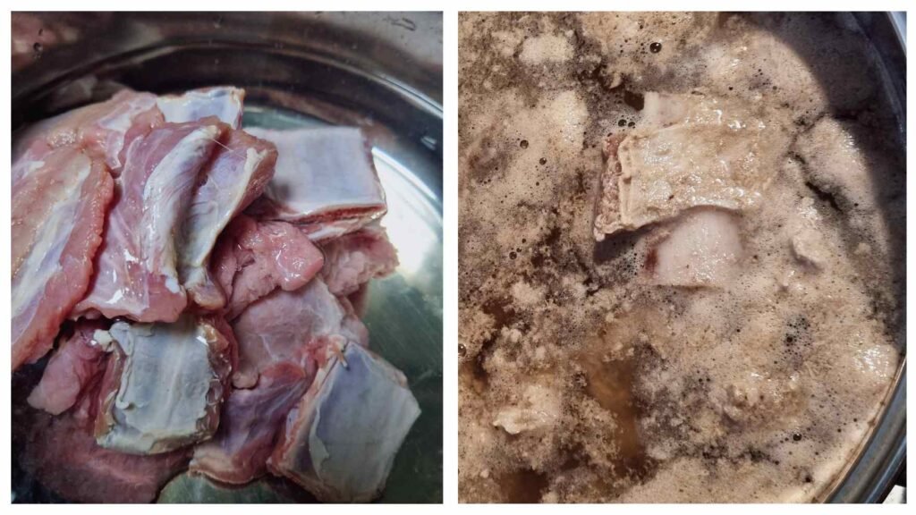 Transfer the ribs to a pot and add enough water to cover them. Boil the ribs for five minutes. Thereafter, remove the ribs from the pot, drain the scum, and return the ribs to the pot. This step is to remove the upper layer of debris that floats on the top during the boiling process, this extra measure will ensure that the Galbi Jjim has a clean taste without any gritty bits and pieces.