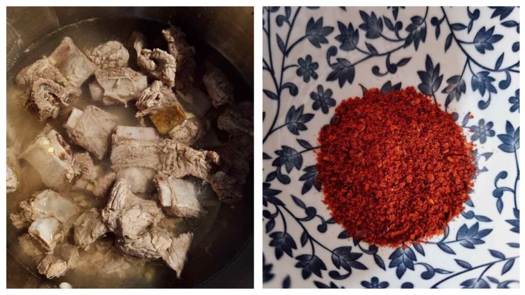 Add about 1 litre of tap water to the pot, or enough to cover all the ribs. Add the white vinegar, ginger, and the beef stock cube to the pot, and boil, with the lid closed, for 60 minutes on medium-low heat. If you have a pressure cooker, cooking the meat will take only 30 minutes. Keep adding 1/2 cup of water every 20 minutes or so to keep the ribs submerged.