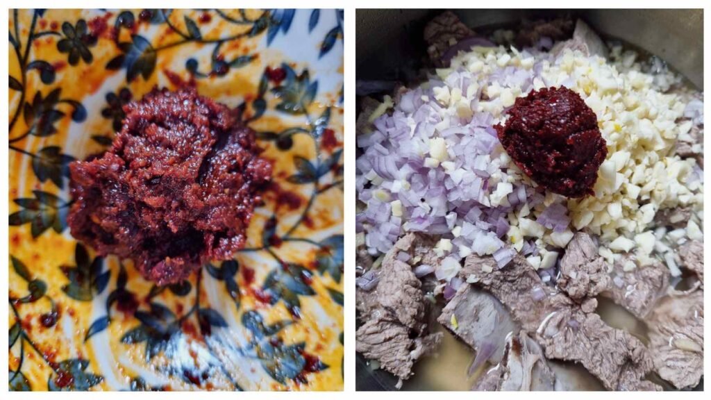 While the ribs cook, prepare the sauce. In a small bowl, add gochugaru, gochujang, soy sauce, sesame seed oil, tomato paste, and black pepper. Stir until it forms a ball of paste. After the meat has been slow-cooked, add the sauce, garlic, and onion to the pot, and gently stir to mix.