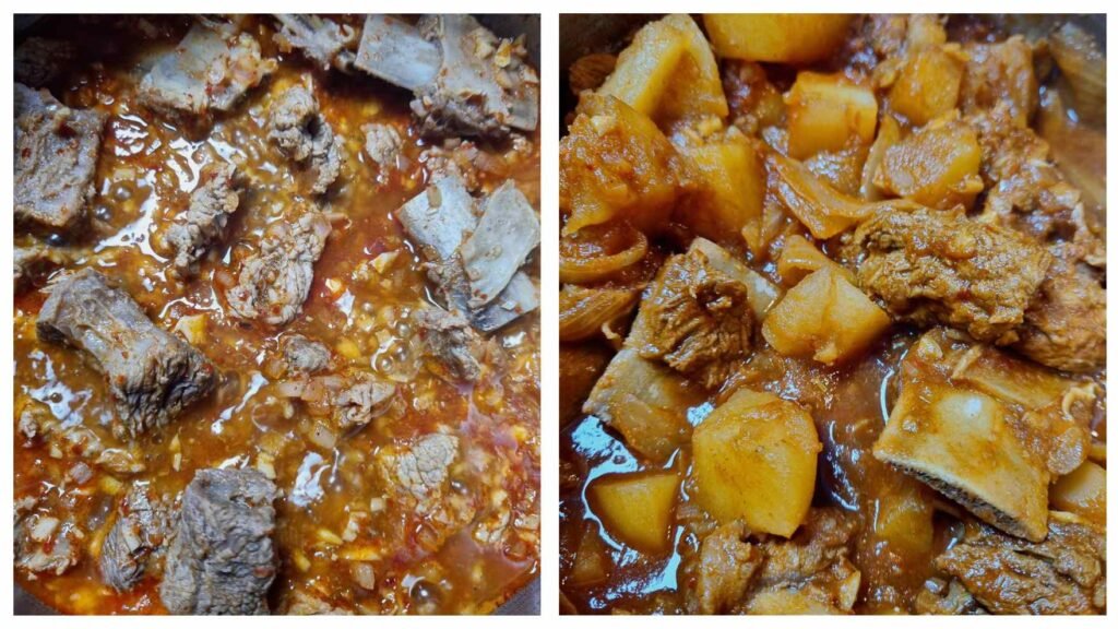 Beef short ribs are the centrepiece of this dish. When slow-cooked, the meat’s flavours are amplified. White vinegar adds a zesty acidity and helps to balance the richness of the meat. The beef stock cube imparts a rich, savoury flavour to the dish. Garlic cloves and onions offer layers of caramelization that build the foundation of the dish. Ginger introduces a warm spiciness; using the fresh root for this recipe is advised. Potatoes add substance and absorb the stew’s flavours, making each bite more satisfying.