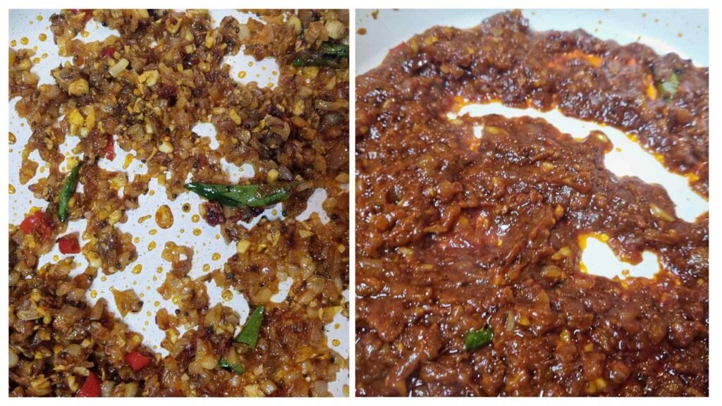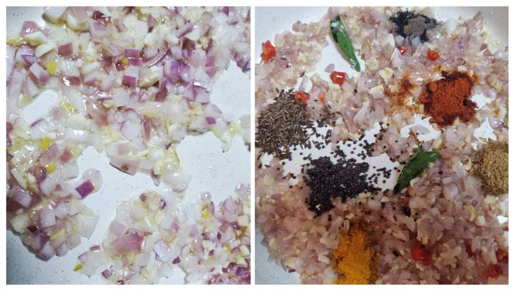Add cooking oil to a pot and set the temperature to medium heat. Once hot, add the onions and ginger, and caramelize until lightly browned. Then add the sliced garlic and sauté for 2 minutes. Once sauteed, add the spices such as mustard seeds and cumin seeds. During this process, the seeds will release their natural oils. Thereafter, add the spices, chilies, and curry leaves.