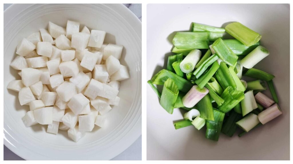 Wash the daikon radish and peel it with a potato peeler. Cut the radish into three sections: first, cut vertically; then cut each section into cubes. Wash the spring onion and slice it. Add the radishes to a bowl and sprinkle salt. Let it rest for 20 to 40 minutes to release moisture.