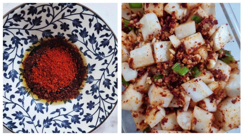 Add the paste to the bowl of radish and spring onions. Coat the cubes with the hot pepper paste until the radish is evenly coated. Store the radish cubes in a glass container on the countertop for 12-48 hours in a cool place. This will jumpstart the fermentation process. Thereafter, store the kimchi in the fridge.