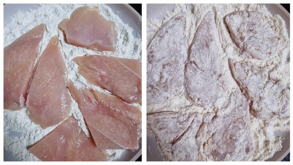 Remove any moisture by dabbing the chicken breast with a paper towel. This will create a thinner piece of chicken. In a bowl, add the flour, garlic powder, salt, and white pepper powder. Dredge the chicken in flour until well coated, then shake off any excess.