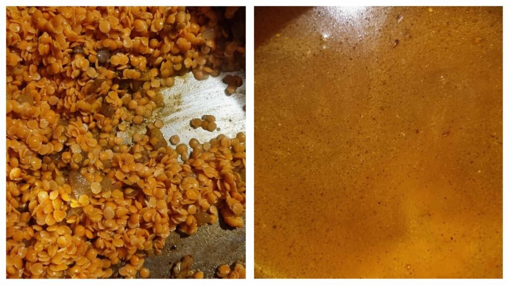 Add the chicken stock cube, turmeric powder, ground black pepper, and salt to the pot. Mix and lightly warm the spices for a few seconds, until they are incorporated into the caramelized onions, ginger, and garlic mixture. Wash the red lentils under running water until they are clean. Swirl them around to ensure that any dust particles are removed and that the water runs clear.