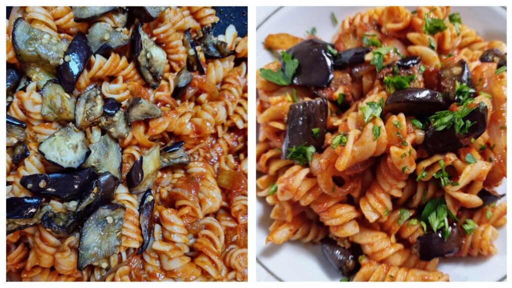 This is a highly flavourful dish that is perfect for vegetarians or individuals that are looking for a delicious and easy recipe. The rich tomato sauce, with the eggplant complements the pasta well. The crunchy & caramelized onions are divine. Sprinkle some Parmesan cheese and you have a highly satisfying meal in the comfort of your home.