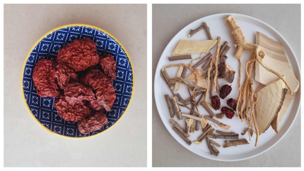 Whole chicken, Ginseng, Jujube, Herbs, Roots, Ginger, and Garlic.