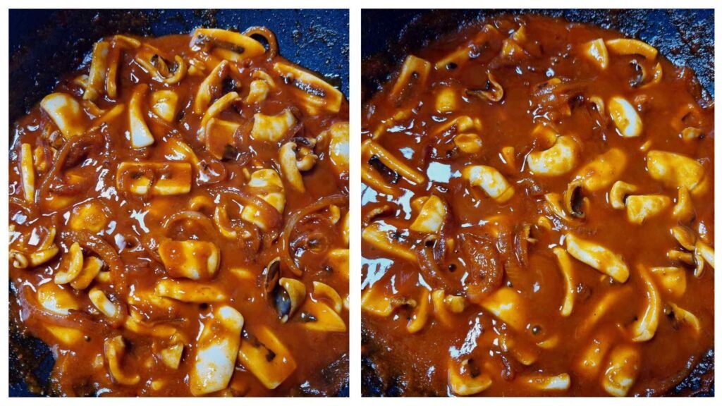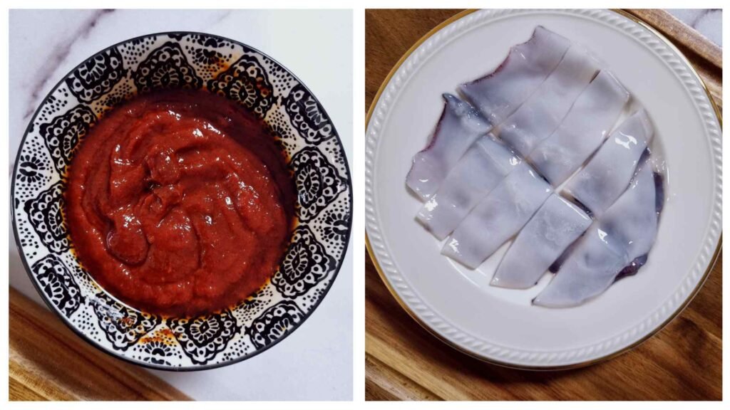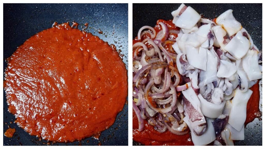 Calamari, Onion, Scallions, Gochuchang, Oyster Sauce, Gochugaru, Soy Sauce, Ginger & Garlic Paste, Sesame seed oil.