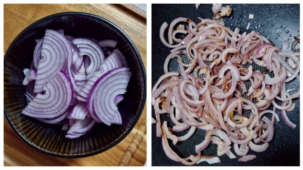 Heat oil in a separate wok over medium-high heat. Add the onion and chives, and begin stir-frying. Ensure the vegetables are constantly moving in the pan; this will prevent them from burning. Gradually, the vegetables will soften and release water. They will caramelize and brown, developing a golden appearance.