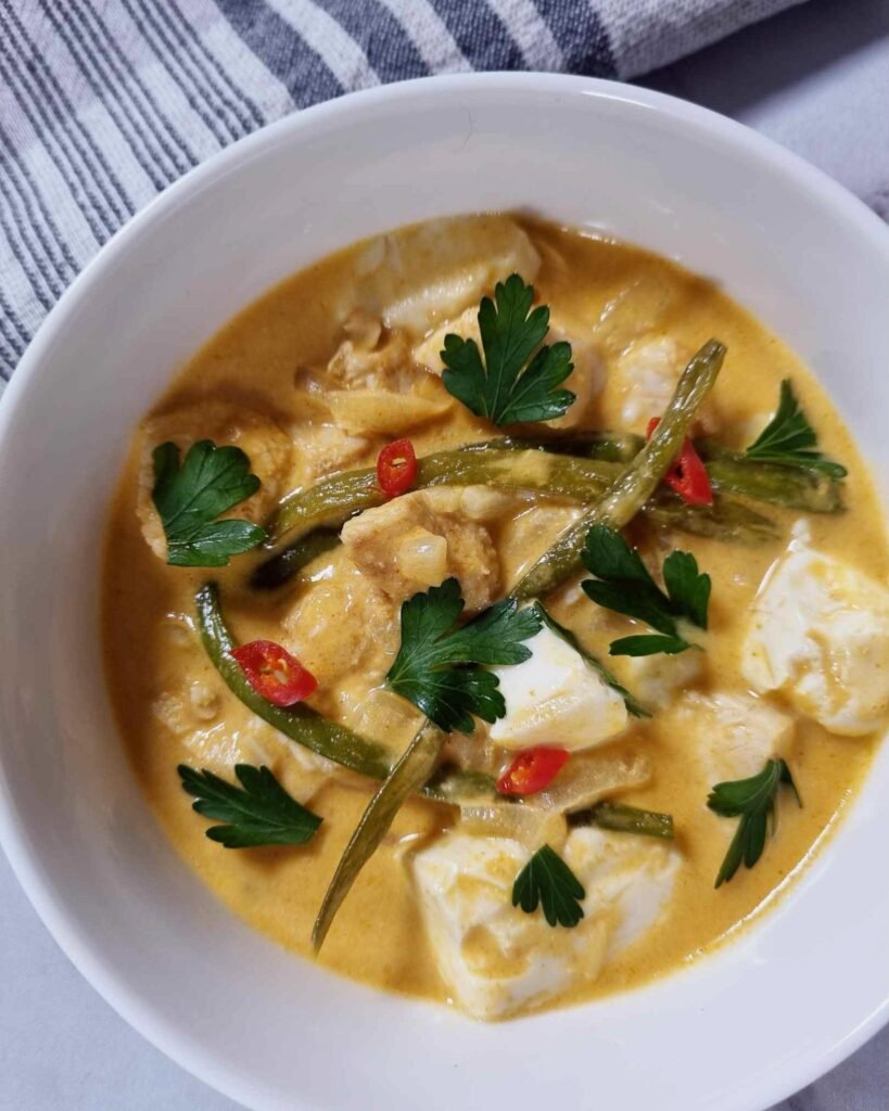 Yellow Curry Paste, Garlic cloves, Onions, Tofu, Chicken Breast, Lime juice, Green beans, Coconut milk, Kefir lime leaves, Thai red chili, Lemongrass stick.
