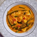 Add the protein: Add chicken, 1/2 cup of water, the remaining coconut cream, lime juice, kefir lime leaves, and lemongrass. Stir in green beans and red chili. Reduce the heat to medium-low and simmer for 20 minutes with the lid on, ensuring the chicken cooks through while the vegetables remain crisp.